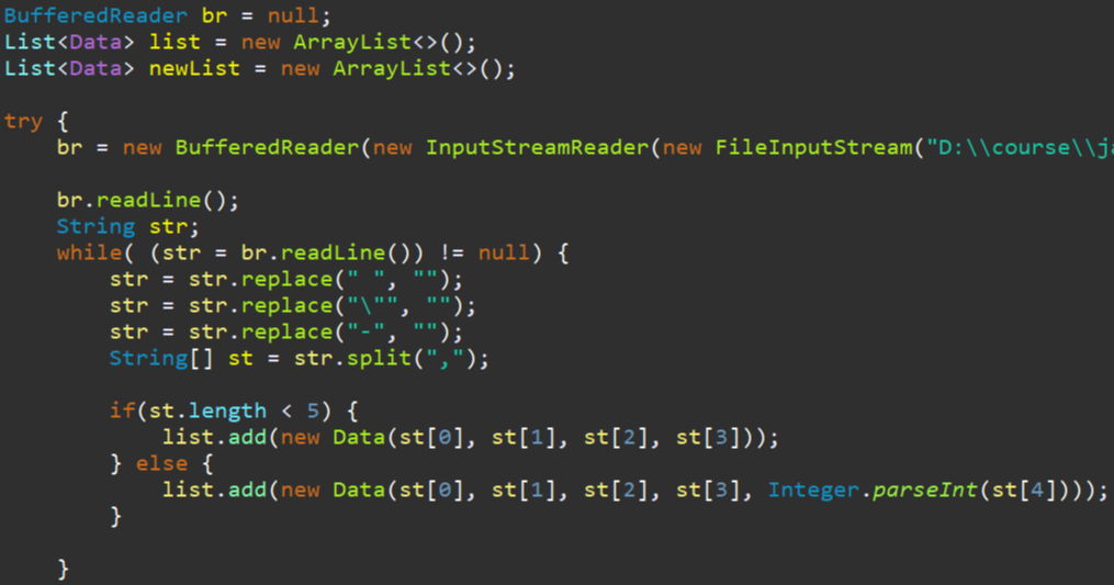 2. , 기준으로 잘라서 Data클래스에 멤버변수에 한줄 단위로 저장