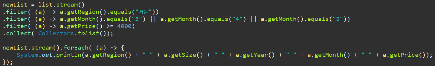 4. 람다식을 이용해서 Null이 아닌 데이터, 지역:서울, (1분기)3,4,5월의, 분양가격 4000이상만
