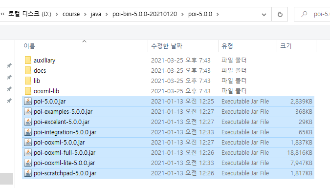 다운로드 했던 Poi 경로에 들어가서, jar 파일을 전부 추가해주면 되겠습니다. lib 랑 ooxml-lib 에 들어 있는 jar도 전부 추가 해주세요