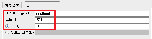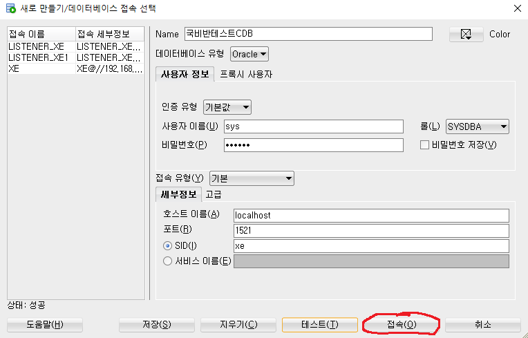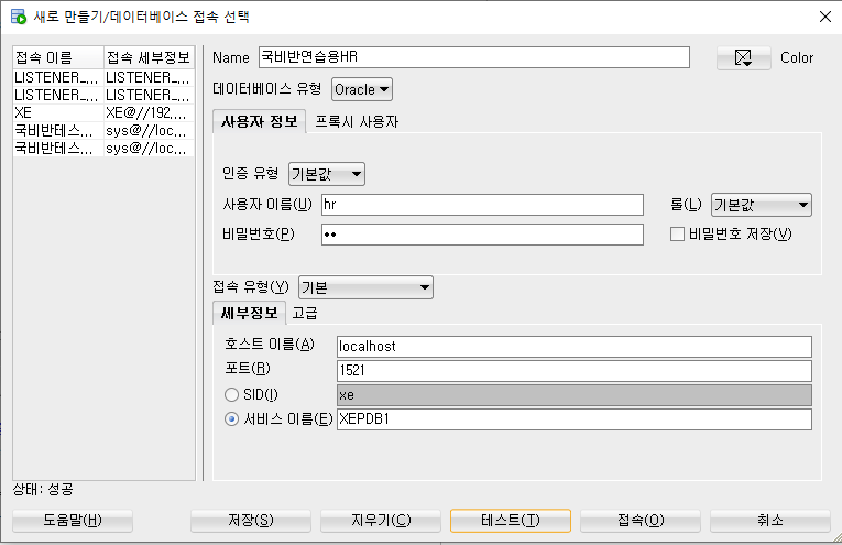 이번에는 아래의 그림과 같이 서비스 이름을 선택하고 "XEPDB1" 을 넣고 테스트 클릭 후 접속합니다.