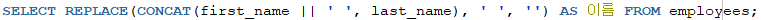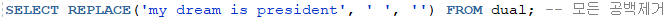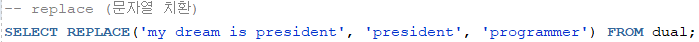 - REPLACE(문자열1, 문자열2, 문자열3) -> 문자열1에 있는 문자열2를 문자열3으로 바꿈