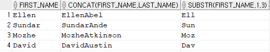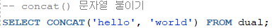 - CONCAT(문자열1, 문자열2) -> 문자열1과 문자열2 붙이기