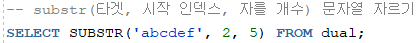 - SUBSTR(문자열, 시작 인덱스, 자를 개수) -> 문자열 자르기