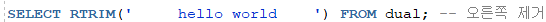- LTRIM ( 왼쪽 공백 제거 ) , RTRIM ( 오른쪽 공백 제거 ) , TRIM ( 양쪽 공백 제거 )