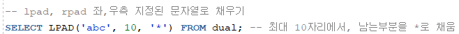 - RPAD(문자열, 최대자리수, 문자) -> 최대자리수 에서, 문자열을 제외한 남는 부분을 오른쪽에서부터 채움
