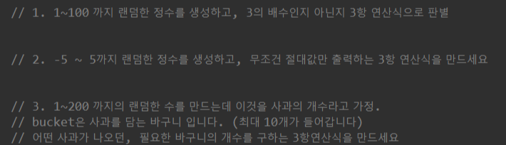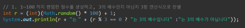 3의 배수인지 아닌지 3항 연산자 사용 System.out.println(r + "은 " + (r % 3 == 0 ? : "3의 배수가 맞다" : "3의 배수가 아니다"))