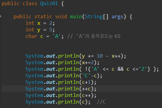 char c = 'A'; -> 'A'의 문자코드는 65 입니다