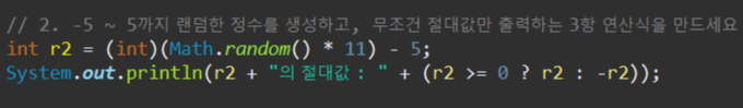 절대값만 출력하는 3항 연산식 -> System.out.println(r2 + "의 절대값 : " + (r2 >= 0 ? r2 : -r2))