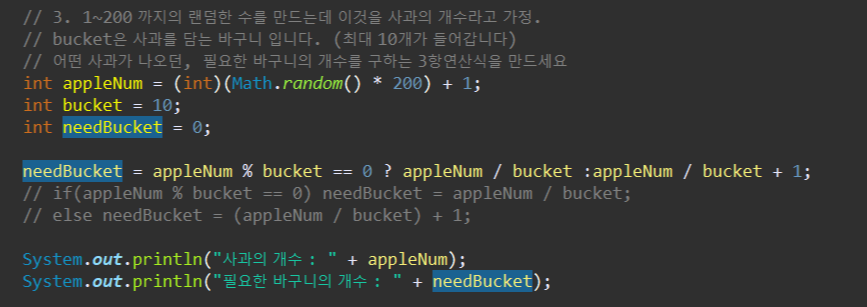 필요한 바구니의 개수 -> int needBucket = appleNum % needBucket == 0 ? appleNum / needBucket : appleNum / needBucket + 1 -> 나머지가 0이 아닐경우 필요한 바구니개수 + 1