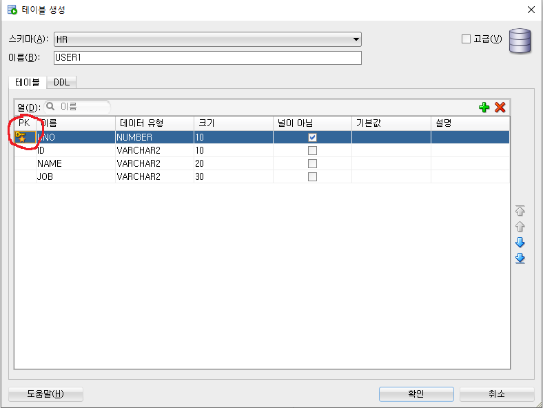 그리고, PK(기본키)를 1개만 클릭해 주세요