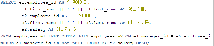6. EMPLOYEES 테이블에서 left join하여 관리자(매니저)와, 매니저의 이름, 매니저의 급여 까지 출력하세요