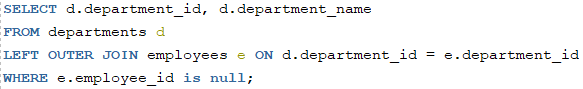 -- departments 테이블에서 직원이 없는 부서를 찾아 출력하세요. LEFT OUTER JOIN 사용