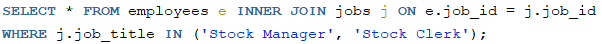 -- employees, jobs 테이블을 조인 지정하고 job_title이 'Stock Manager', 'Stock Clerk'인 직원 정보만 출력하세요.