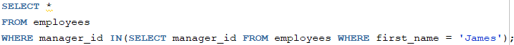 -EMPLOYEES테이블에서 “James”(2명)들의 manager_id와 같은 모든 사원의 데이터를 출력하세요.