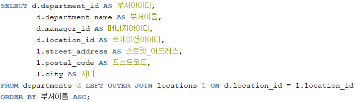 조건) 부서아이디, 부서이름, 매니저아이디, 로케이션아이디, 스트릿_어드레스, 포스트 코드, 시티 만 출력합니다