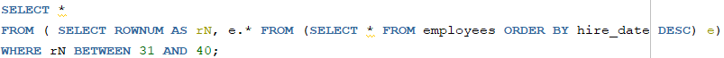-EMPLOYEES테이블에서 hire_date기준으로 오름차순 정렬하고, 31~40번째 데이터의 행 번호, 사원id, 이름, 번호,