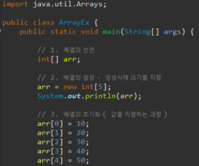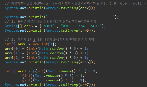 그리고, Arrays.toString(배열 변수이름); 은 배열에 있는 값을 String 형으로 반환시켜 주는 코드인데, 외워주세요