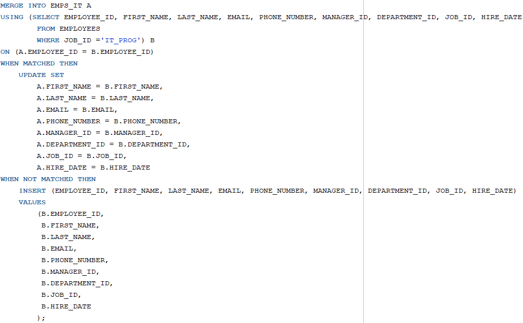 즉. merge 의 대상이 되는 테이블을 A라고 하고, 병합시킬 테이블을 B하고 한다면 B테이블을 가지고 추가,수정,업데이트,삭제 등의 DML문을 사용하고, A라는 테이블에는 B테이블이 가지고 있는 데이터만 추가하는 그런 기능 입니다.
