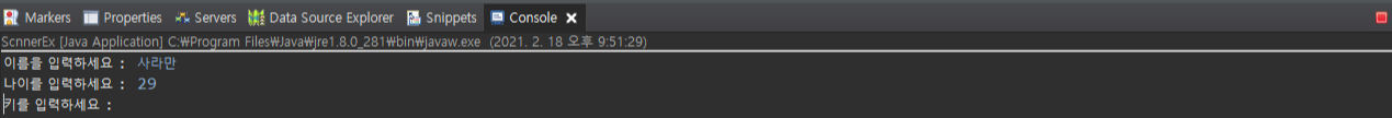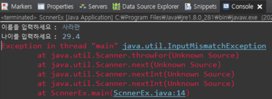 int 형 정수를 입력받는 age에 실수 29.4를 입력하면, 이렇게 오류가 발생이 되면서 뒤에 키를 입력받아야 하지만 중간에 실행이 끝난 걸 확인 할 수 있습니다. 정해진 데이터 유형의 값만 변수에 저장이 가능하기 때문