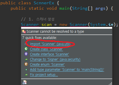 그런데 사용하려고 코드를 입력했더니 Scanner 밑에 사용못한다고 빨간 줄이 생기는데, Scanner에 마우스를 올려서 import 'Scanner' (java.util) 을 클릭해주면 사용이 가능합니다.