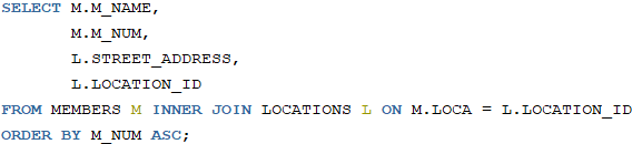 -MEMBERS테이블과 LOCATIONS테이블을 INNER JOIN 하고 m_name, m_Num, street_address, location_id컬럼만 조회