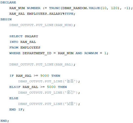 4. 1~120사이의 랜덤한 번호를 이용해서 DEPARTMENT_ID 의 첫번째 행만 SELECT합니다. 뽑은 사람의 SLALRY를 9000 이상이면 높음, 5000 이상이면 중간, 나머지는 낮음으로 출력.