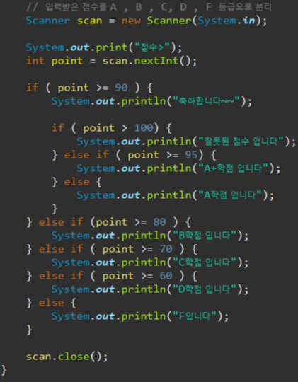 그리고 switch문 안에서 if문을 쓸수 있고 반대로 if문 안에서 switch문을 쓸 수 있습니다.