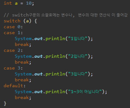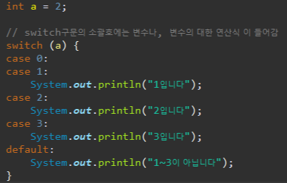 Switch 옆에 있는 소괄호() 안에는 변수 또는 변수에 대한 연산식이 들어갑니다.