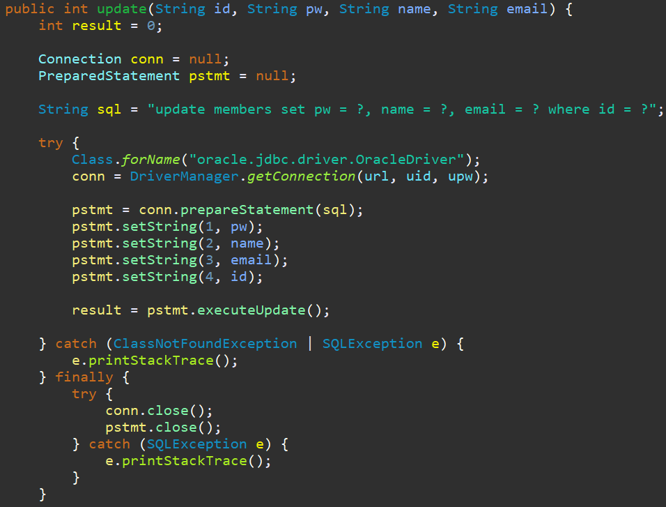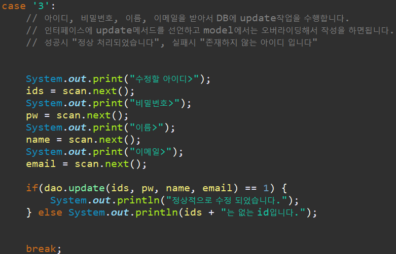 어제 하던, JDBC를 사용해서, 데이터베이스에 접근한 뒤에 DML의 기능들을 클래스로 분할하는 걸 마저 해봅시다.
