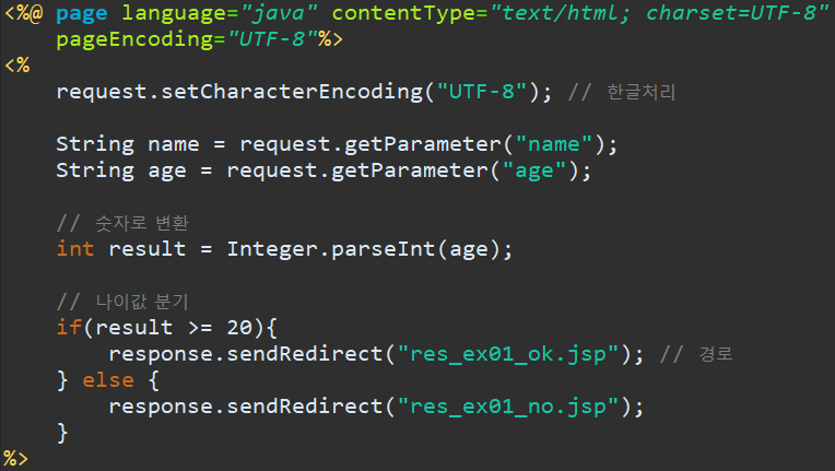 여기에서는, 넘겨준 데이터들을 가지고, 처리를 한 후 if문을 통해서 response.senRedirect 로 처리 했습니다.