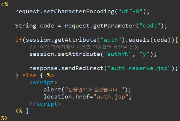 다음 파일인 auth_ok.jsp 에서, form으로 넘어온 값과 session에 있는 값을 비교하고, 같다면, 예약 페이지로 넘어갈 수 있도록 합니다.