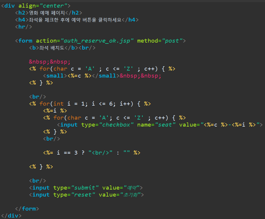 그리고, 예약에 성공한 좌석을, 아예 선택을 못하도록 auth_reserve.jsp 의 체크박스를 if문으로 그려 줍니다.