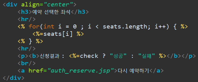 위와 같이 처리를 했다면, <body>에서 선택한 좌석 및 좌석 예매에 성공했는지 화면에 나타내 줍니다.