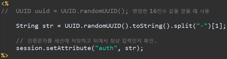 인증문자는 UUID.randomUUID() 를 이용합니다. ( 랜덤 16진수 값 )