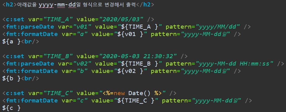 <fmt:parseDate var="사용할 변수명" value="값" pattern="형식">