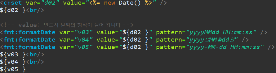 <fmt:formatDate var="사용할 변수명" value="값" pattern="형식">