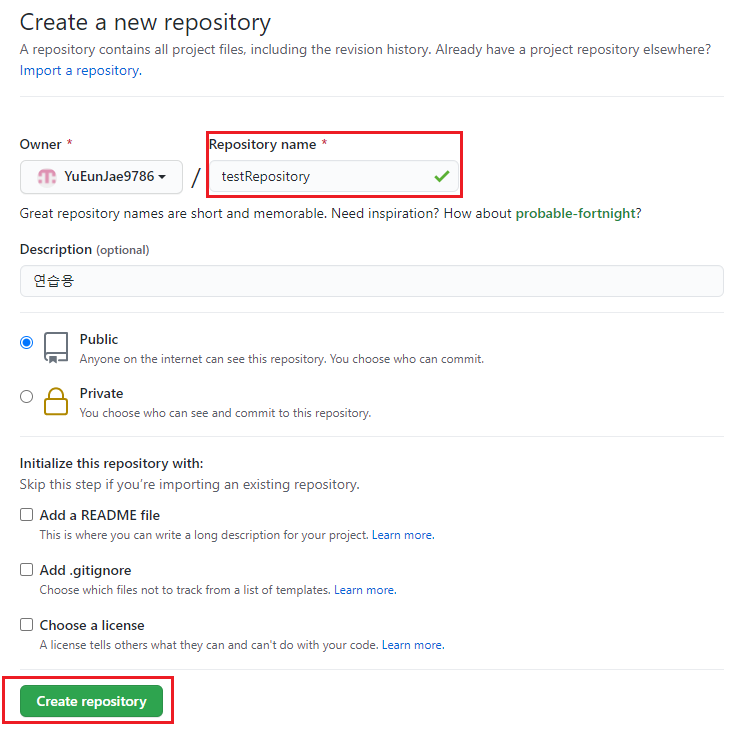 아래의 Repository name 을 작성한 후에, Create repository 를 눌러줍니다. ( Description 은 주석느낌 )