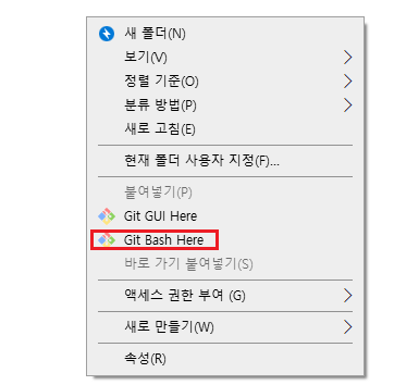 회원가입까지 완료 되었다면, git 폴더에 들어가서 마우스 우클릭 -> Git Bash Here 를 눌러 줍시다.