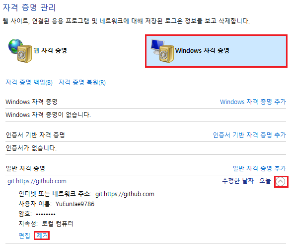 Windows 자격 증명을 클릭하고, 아래에 나오는 github.com 의 자격 증명을 제거 해줍니다.