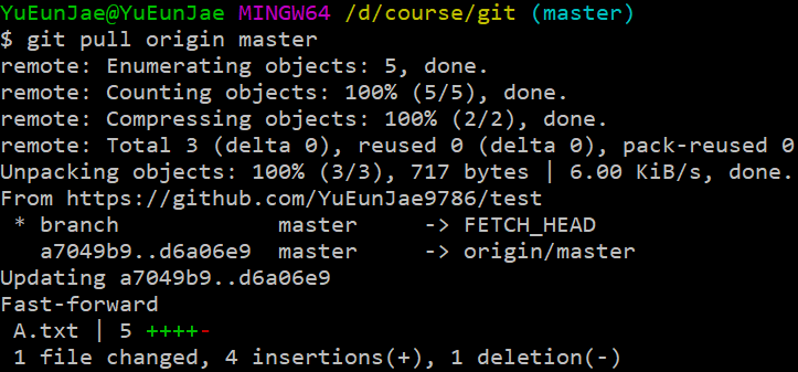 그러면, 제 로컬 저장소는 마지막 커밋으로 돌아가게 되고, 이 때 pull 을 사용해서 로컬저장소를 원격저장소와 같게 만듭니다.