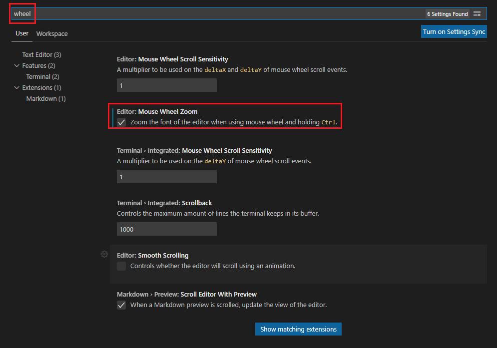 처음에 그냥 사용하게 되면, visual studio code 의 글자가 너무 작기 때문에, whell 검색을 한 후 아래의 체크박스를 클릭해주세요 ( 마우스 휠 줌 ) -> ctrl + 마우스 휠으로 글자 크기를 확대 및 축소할 수 있습니다.