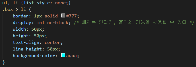 disply : inline-block -> 줄바꿈은 일어나지않음(인라인), block요소들의 크기, 높이, 정렬 기능을 사용할 수 있게 해줍니다