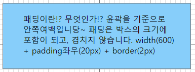 패딩은 윤곽 기준으로, 안쪽여백을 의미 합니다. 박스의 크기에 포함이 되고, 패딩끼리 겹치지 않습니다.