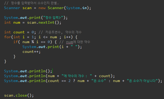 다음 예제를 볼까요? 입력받은 값이 소수인지 아닌지를 판별하는 코드 입니다.