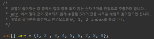 - 배열이 들어있는 값 중에서, 절대 중복되지 않는 숫자 3개를 랜덤으로 추출하려 합니다.