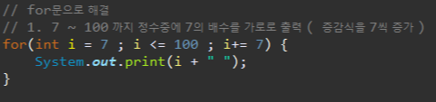 - 7 ~ 100 까지 정수 중에 7의 배수를 가로로 출력 (증감식을 7씩 증가)