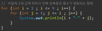 1 번째 for 문에서 i가 1일 때, j는 1부터 9까지 반복되고, i가 2일 때, j는 1부터 9까지 반복됩니다.