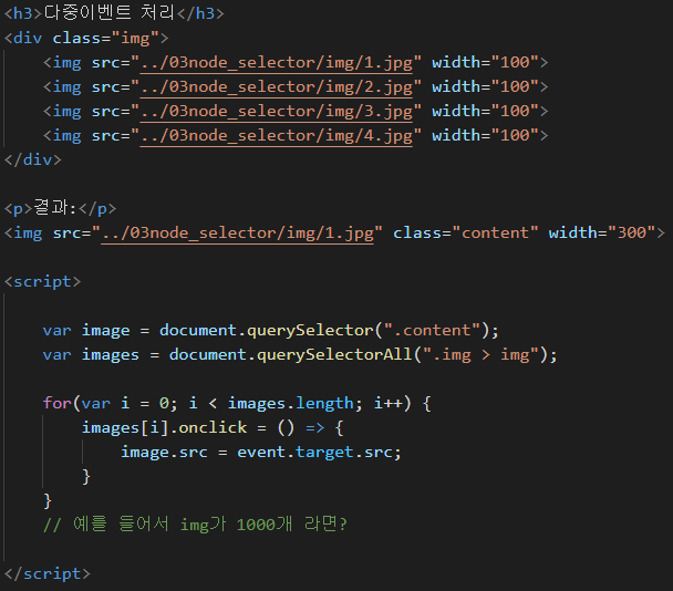 예를 들어서 img 가 1000개 였다면, for문을 1000번 돌아야 겠죠? ( 비효율적 ) 그렇기 떄문에, 이벤트 위임 이라는 기능을 사용 합니다.