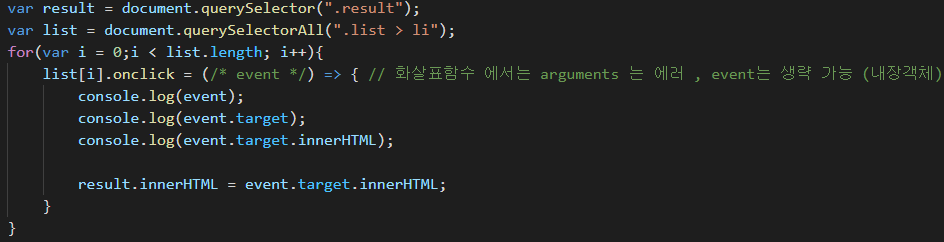 위에서 event 객체를 사용하기 위해서, 각각의 <li> 에 전부 onclick 를 걸었었죠?