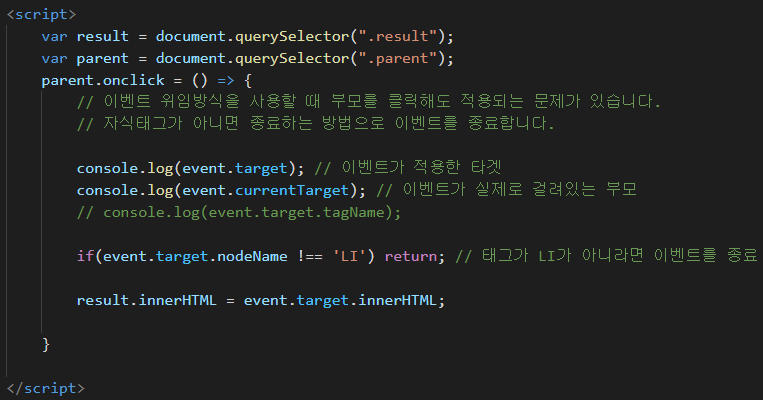 그렇기 때문에, 부모영역을 클릭했을 때는, return 을 사용해서 작동되지 않도록 해줍니다.